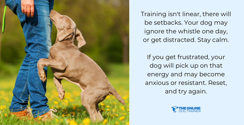 Training isn't linear, and there will be setbacks. Your dog may ignore the whistle one day, or they may be too distracted by a squirrel. Stay calm.