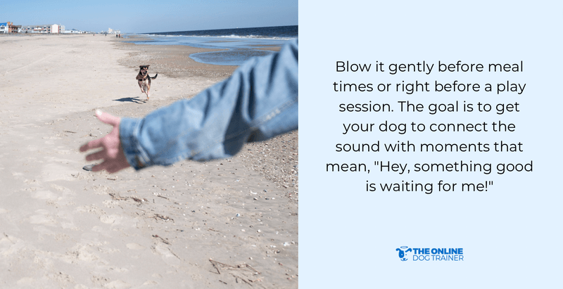 Blow it gently before meal times or right before a play session. The goal is to get your dog to connect the sound with moments that mean, “Hey, something good is waiting for me!”