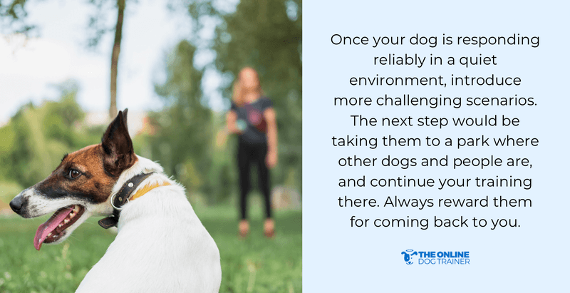 Once your dog is responding reliably in a quiet environment, introduce more challenging scenarios.