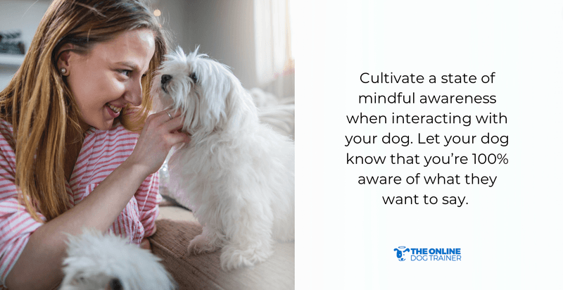 Cultivate a state of mindful awareness when interacting with your dog. Let your dog know that you’re 100% aware of what they want to say.